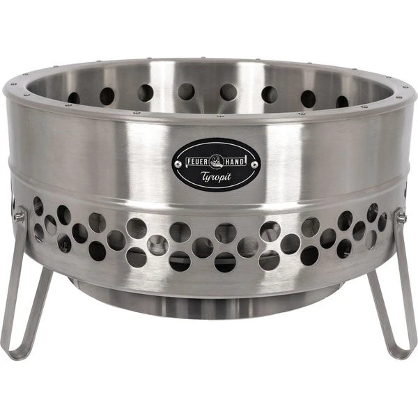 Die Feuerschale Tyropit von Feuerhand liefert gemütliches Licht und Wärme und bringt das Knistern in jede Terrassenrunde. Die doppelwandige Feuerschale aus Edelstahl eignet sich hervorragend, um gesellige Abende mit Familie oder Freunden bei Stockbrot und Würstchen am Spieß zu verbringen. Mit einer Standhöhe von etwa 35cm hat der Tyropit die ideale Größe, um sich gemeinsam mit Freunden rund um die Feuerschale zu versammeln. Außerdemdem wärmt die Feuerschale von Feuerhand nicht nur auf angenehmer Höhe, sondern gefällt auch durch ihre geschmackvolle Gestaltung im zeitlosen Industriechic. Die konstante Luftzufuhr von unten und die zusätzliche Sauerstoffzuführung durch den doppelwandigen Korpus erzeugen eine besonders effektive Holzverbrennung. Die entstehende Sekundärverbrennung sorgt für einen ruß- und raucharmen Betrieb. Die Luftzufuhr in der Mitte deines Terrassenfeuers versorgt die Flammen zusätzlich mit Sauerstoff. Die Glut wird auf dem herausnehmbaren Kohlerost zusammengehalten, während die Verbrennungsrückstände in der ebenfalls entfernbaren Ascheschale mit Funkendom aufgefangen werden. Der Funkendom verhindert zudem das Herausfallen von Glut oder Funken und ein Hitzeschild am Boden schont den Untergrund. Auf drei Standbeinen ruhend steht der Tyropit stabil und kippsicher. Der Edelstahlkorpus ist dabei nicht nur besonders robust und hitzebeständig, sondern bildet mit der Zeit eine charmante und einzigartige Patina aus. Diese Materialverfärbung ist normal und abhängig von Hitzegrad, Befüllung und Art des Brennmaterials.Art.-Nr.: 1613672